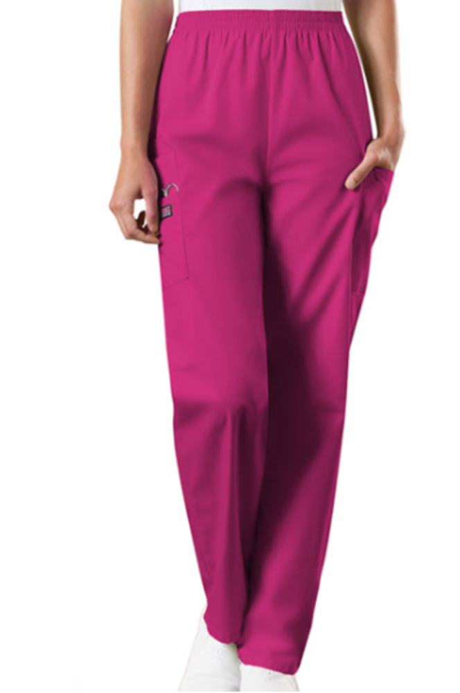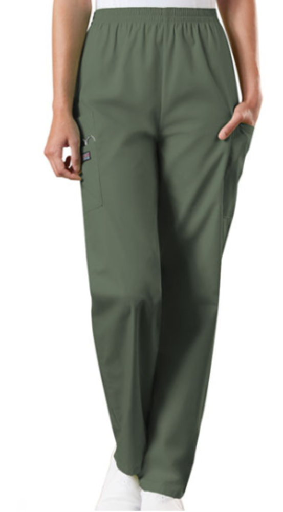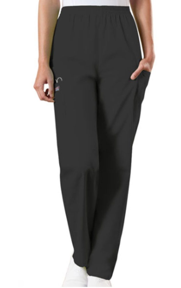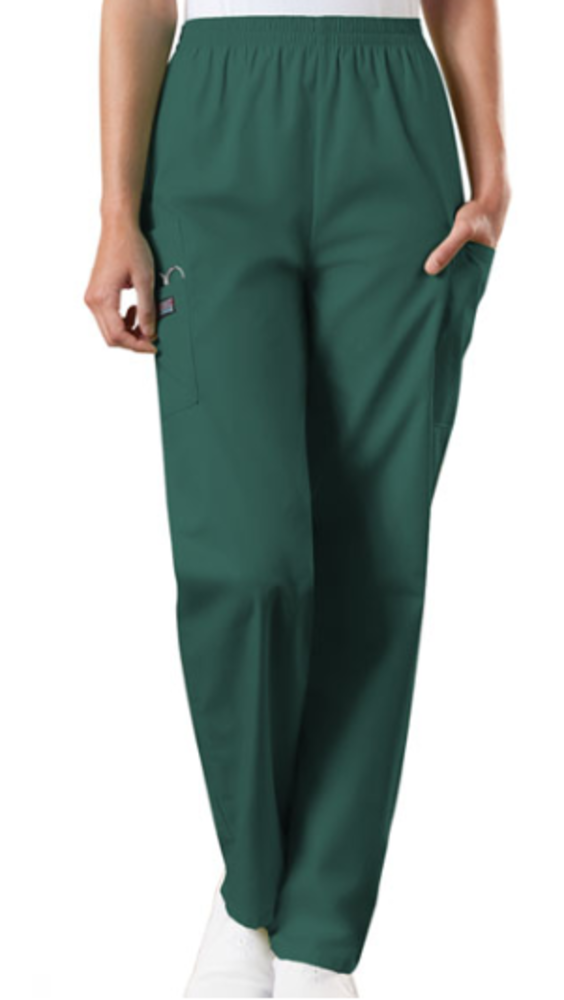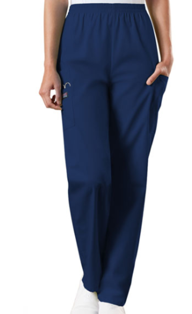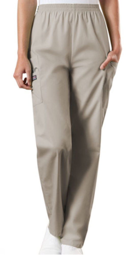 This Traditional Classic fit, elastic waist utility pant features a natural rise and tapered leg, two cargo pockets, a cell phone pocket and an outside scissor pocket. Inseam 30".