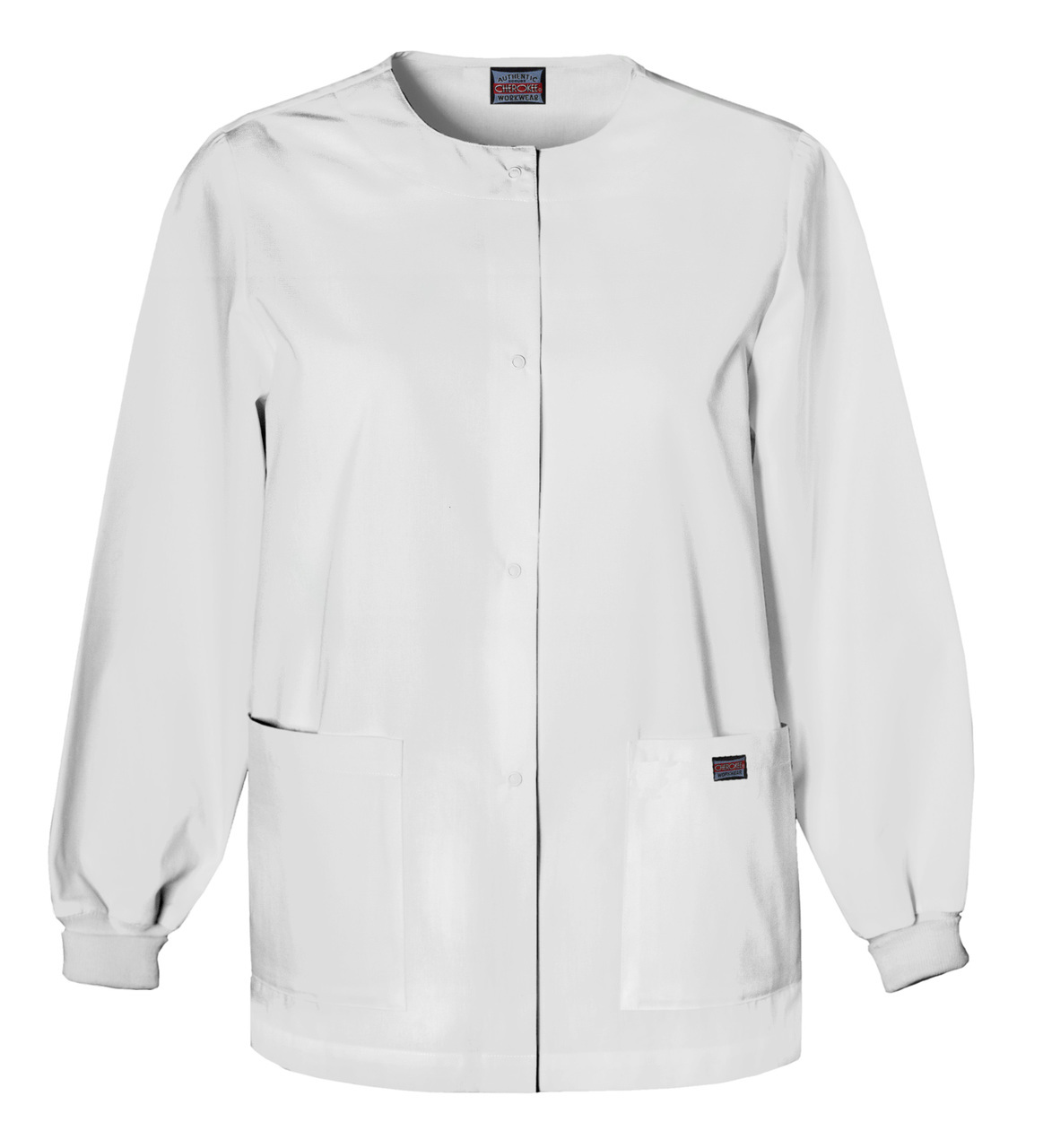 sku: 4350A Traditional Classic fit, round neck snap front warm-up with two patch pockets, knit cuffs, and a cell phone pocket. Center back length: 27 1/2".